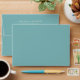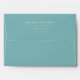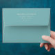 This wedding envelope features a minimalist design with centred text on a solid teal background, creating an elegant and sophisticated look. The layout is simple and balanced, utilising clean lines and precise spacing for a modern feel. The typography employs a classic serif font that adds formality, while the monochromatic colour palette ensures readability and a professional appearance. Perfect for weddings, this envelope conveys clarity and elegance through its straightforward and uncluttered presentation.