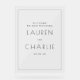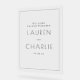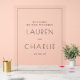 This elegant wedding sign features a minimalist design with a clean, peach background and crisp black typography. The layout is centred and vertically aligned, creating a balanced and sophisticated look. Customisable text allows for personalisation with names and dates, making it perfect for welcoming guests at your special event. The modern sans-serif font adds a touch of elegance, while the simple colour palette enhances readability and style. Ideal for couples seeking a chic and uncluttered aesthetic to celebrate their union.