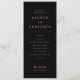 This elegant wedding program features a sleek, vertical layout with centered alignment on a solid black background, creating a striking contrast with crisp white text. The design showcases a sophisticated serif font for the main title and a smaller cursive script for "and," adding a touch of elegance. Customizable placeholders allow for easy personalization of names, dates, and locations, while the organized list format ensures clarity in presenting ceremony details. The minimalist style emphasizes formality and sophistication, making it perfect for traditional weddings.