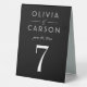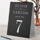 Modern and chic black wedding table number signs feature a stylish white typographic design with elegant custom text that can be personalised with a monogram of the bride and groom names and the table number. Note: to order, add each individual table number (1,2,3...) to your shopping cart.