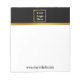 At the top, there's a thick black stripe which has a display image you can replace with your logo. A thin faux gold stripe is under the black stripe. Then there's a white writing area. At the bottom, there's black display text you can replace with your website or custom text. The gold look is artwork (not foil).