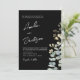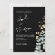 This elegant wedding invitation features a dramatic black background accented with delicate watercolor botanical florals and eucalyptus greenery for a refined, romantic look. The soft neutral blooms beautifully contrast against the dark backdrop, creating a sophisticated modern design. Stylish handwritten script highlights the couple’s names, while clean typography presents the wedding details with timeless elegance. Perfect for modern, formal, or evening weddings, this invitation combines botanical charm with contemporary styling to create a memorable first impression for your special day.