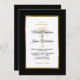 Invite your guests to help you celebrate your special day with this elegant invitation featuring modern script, black and gold text including an artistic palm tree and metallic gold foil frame on the front of the card. A black background is on the front and back.
