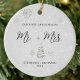 An elegant, black and white Christmas ornament for a newlywed couple with the title "our first Christmas as Mr and Mrs", featuring a pine tree and snowflakes covered in rhinestones and glitter (these are digital effects, not real stones or glitter!) and a shimmering, white winter background. Modern, simple and elegant.