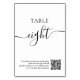 Elegant black white script wedding table number, with QR code to scan for your guests to share their photos.