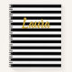 Personalise with your name (or other text) in faux (not foil) gold script on a black and white striped notebook.