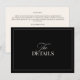 A classic and elegant wedding details card featuring a black background with refined white typography and a delicate border. The front displays “The Details” in timeless script, while the back is fully customizable for accommodations, directions, dress code, and more. Perfect for formal, modern, or black-tie wedding suites.