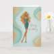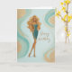 A stylish birthday card featuring a glamorous blonde in a sparkling teal and gold dress, set against a soft abstract background with flowing gold accents. Perfect for celebrating someone with confidence, beauty, and effortless style.