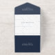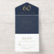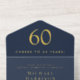 Elegant dark navy blue 60th birthday party all-in-one invitation featuring "Cheers to 60 Years," your name, invitation details and a tear-away RSVP response postcard written in classic serif typography and simple modern lettering, all rendered in your choice of genuine gold, silver or rose gold foil.