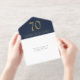 Elegant and chic dark navy blue 70th birthday party all-in-one invitation featuring "Cheers to 70 Years," the honoree's name, your invitation details and a tear-away RSVP response postcard in classic serif typography and clean modern lettering, all rendered in your choice of genuine gold, silver or rose gold foil.