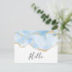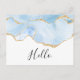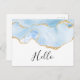 A hello postcard with a beautiful icy blue agate design with faux gold glitter accents.