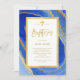 These beautiful Baptism invitations feature a painted geode look background, with various shades of blue and faux gold accents and frame. Trendy modern faux gold script typography and a matching faux gold cross also appear.