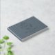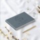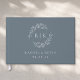 Custom-designed steel blue and silver foil wedding guestbook featuring modern elegant foliage wreath monogram with personalised couple's initials, name, and wedding date.