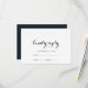 Elegant dark blue text and white background with delicate faux metallic dots on the front, and plain dark blue back wedding response card.