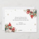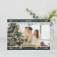 Elegant blue photo Happy Holidays card featuring gold holly with berries on the front and a watercolor painting of poinsettia, holly and red berries at the back.