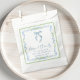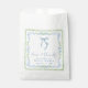 Elegant bridal shower party favour bags featuring grandmillenial-inspired vintage green scallop and blue floral watercolor frames, a delicate blue coquette bow watercolor, "love + thanks" showcased in an elegant blue calligraphy script, and the name of the bride and shower date in classic serif typography.