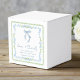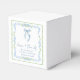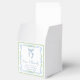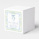Elegant bridal shower party favour boxes featuring green scallop and blue floral watercolor frames, a delicate blue coquette bow watercolor, "love + thanks" showcased in an elegant blue calligraphy script, and the name of the bride and shower date in classic serif typography.