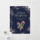 Elegant blue Christmas card featuring sparkling snowflakes, candy canes, holly and red berries on a dark blue background.