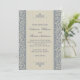 A beautifully elegant wedding invitation with a blue and beige baroque damask pattern overlaid with a coordinating inset of two-tone beige stripes. Matching blue text colour completes the design. All of the text on this invitation may be edited to your desired wording.