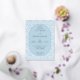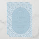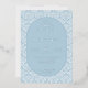 This elegant wedding invitation features a symmetrical layout with a central oval focal point, set against a light blue damask pattern background. The design uses a harmonious color palette of soft blues and incorporates classic serif typography for a formal touch. Decorative flourishes and dots enhance the sophisticated aesthetic, while customizable text fields allow personalization for names, dates, and locations. Perfect for couples seeking a refined and timeless look to celebrate their special day.
