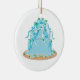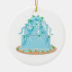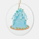 An elegant cake in a pretty blue colour with darker blue cascading ribbons and flowers on top. A beautiful cake plate accented with little flowers around it.