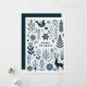 Minimalist holiday card design with a Scandinavian-inspired theme. The card features a simple navy blue and white colour palette, with intricate, stylised illustrations of flora and fauna, including birds, deer, leaves, and abstract plants, arranged in a harmonious and balanced layout around a central text box. The central box has a clean, modern font with the message "Happy Holidays" The design evokes a natural, festive feel with elegant, hand-drawn details, capturing a modern yet timeless aesthetic.