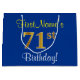 This simple, elegant birthday gift bag design features a personalised message like "FirstName’s 71st Birthday!" (with the "71st" having a faux/imitation gold-like colouring look) on a blue coloured background. The name is in script-like, yellow-coloured text, and can be customised. A personalised birthday gift bag like this could perhaps be used when giving a present or gift to somebody who is celebrating their seventy first birthday. [~Z0000260]
