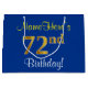 This simple, elegant birthday gift bag design features a personalised message like "NameHere’s 72nd Birthday!" (with the "72nd" having a faux/imitation gold-like colouring look) on a blue coloured background. The name is in script-like, yellow-coloured text, and can be customised. A personalised birthday gift bag like this could perhaps be used when giving a present or gift to somebody who is celebrating their seventy second birthday. [~Z0000260]