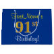 This simple, elegant birthday gift bag design features a personalised message like "FirstName’s 91st Birthday!" (with the "91st" having a faux/imitation gold-like colouring look) on a blue coloured background. The name is in script-like, yellow-coloured text, and can be personalised. A personalised birthday gift bag like this could perhaps be used when giving a present or gift to somebody who is celebrating their ninety first birthday. [~Z0000260]