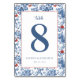 This elegant wedding table card features a classic design with a white central area framed by a vibrant floral border in shades of blue and red. The bold, navy blue number "8" is prominently displayed, accompanied by the word "table" in an elegant cursive script above it. Below the number, customisable names and date are printed in a simple serif font, adding a personal touch to this sophisticated piece. The intricate floral motifs and harmonious colour palette create a romantic and celebratory atmosphere, perfect for enhancing your special day.