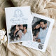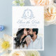 Announce your upcoming wedding in style with this classic blue photo save the date card. The front showcases your custom monogram initials inside a soft blue floral crest on a white background. Your names appear in elegant blue calligraphy, followed by your wedding date and location. A horizontal engagement photo beneath adds a personal, memorable touch. On the back, display a vertical engagement photo with a convenient QR code that guests can scan to access your wedding website and any custom instructions. A timeless and versatile choice, perfect for coastal weddings or classic celebrations.
