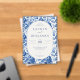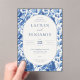 This is a vintage style image featuring an elegant wedding invitation surrounded by intricate blue floral patterns. The design exudes sophistication and charm with its classic colour palette of deep blues on a crisp white background, creating a timeless and romantic atmosphere. Perfect for setting the tone for a beautiful celebration, this invitation invites guests to join Lauren and Benjamin on their special day at Willowbrook Estate in Atlanta, Georgia.