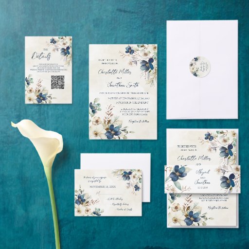 Elegant Blue Floral Winter Wedding Invitations