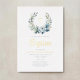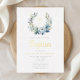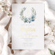 Elegant Blue Floral Wreath Cross Boy Baptism Gold Foil Invitation.