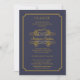 An elegant banner scroll and scalloped frame gold tone and blue graduation party invitation design that can be personalised for high school, college or university graduations. Design by Holiday Hearts Designs (all rights reserved).