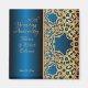 The rich sapphire blue background is beautifully contrasted by an ornate, filigree pattern in shining vintage gold. Inspired by art deco and royal aesthetics, the elaborate lace-like mandala motif is accented with glistening jeweled details, creating a truly regal look. The elegant, flowing script typography highlights the names of the honored couple and the date, ensuring a sophisticated presentation.