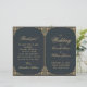 An elegant folded wedding program with a vintage air, having having on both sides two identical elegant gold baroque decorative frames around the texts. The titles and the names of the bride and groom are written in an elegant calligraphic script, the rest in caps. The background is dark blue, the text is golden, similar to the gold frames.