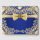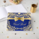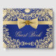 Blue and gold guest book with gold jewel bow on an elegant royal blue and gold swirl background. You can easily customise this beautiful royal blue and gold guest book for your event by simply adding the text of your choice in the font style you prefer. This is a printed design with no real bows, jewels, etc.