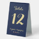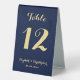 Create your own custom, personalised, modern, elegant, stylish, simple, minimalist, classy, stylish, chic, beautiful faux gold typography script on dark navy blue background, red hearts, white plastic polystyrene, table number tent sign, featuring the bride & groom's names and the wedding date. To customise, simply type in the table number, the couple's name (bride & groom / husband & wife), and the wedding / marriage anniversary date. While you personalise, you'll be able to see a preview throughout. Perfect for wedding, bridal shower, anniversary celebrations, dinner party, or other special occasion, for wedding planners, event managers, venue management companies, restaurant, cafe, hotels, resorts, hospitality industry, convention centres, small business, and more.