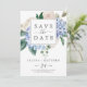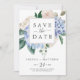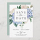 This elegant blue hydrangea white save the date card is perfect for a spring or summer wedding. The classic floral design features soft powder blue watercolor hydrangeas accented with neutral blush pink flowers and green leaves.