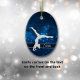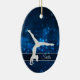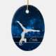 This elegant ornament features a silver silhouette gymnast during a handstand against a pretty blue background with tiny star lights. Her name is in silver on a semi transparent banner that is framed in white faux glitter. The back of the ornament has the same blue background with three custom text fields at the center of a fancy faux diamond framed banner. Perfect for that daughter, granddaughter, or niece who is a gymnast.