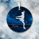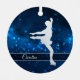 This elegant ornament features a silver silhouette female ice skater against a pretty blue background with tiny star lights. Her name is in silver on a semi transparent banner that is framed in white faux glitter. The back of the ornament has the same blue background with three custom text fields at the centre. Perfect for that daughter, granddaughter, or niece who is a skater.