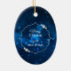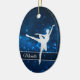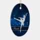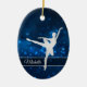 This elegant ornament features a silver silhouette ballerina against a pretty blue background with tiny star lights. Her name is in silver on a semi transparent banner that is framed in white faux glitter. The back of the ornament has the same blue background with three custom text fields at the center of a fancy faux diamond framed banner. Perfect for that daughter, granddaughter, or niece who is a ballet dancer.