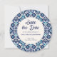 Make your wedding unforgettable with this elegant Save the Date card featuring a luxurious blue Mediterranean tile design. Intricate cobalt and turquoise geometric patterns frame a clean white space for your names, wedding date, and custom message. Perfect for couples seeking a sophisticated, timeless look with a touch of artistic flair. Ideal for printing on high-quality cardstock or sending digitally to your guests.