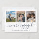 Elegant Blue Engagement announcement card featuring 3 of your photos, with Engagement Party invitation on back. Easy to personalise.