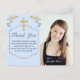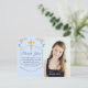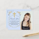 Thank your family and friends for attending your daughter's Confirmation or giving her a gift with this pretty floral gold cross Confirmation thank you postcard. A pale blue background sets an elegant tone as soft floral bouquets in blue and peach decorate the top corners. A simple gold cross honours the centre of this girl's Confirmation thank you. Personalise with your daughter's name and a special note, as well as a photo of your child. Add your name and return address on the back for a super convenient sendout.