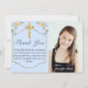 Thank your family and friends for attending your daughter's Confirmation or giving her a gift with this pretty floral gold cross Confirmation thank you card. A pale blue background sets an elegant tone as soft floral bouquets in blue and peach decorate the top corners. A simple gold cross honours the centre of this girl's Confirmation thank you. Personalise with your daughter's name and a special note, as well as a photo of your child.
