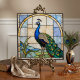 Add a touch of timeless elegance to your home décor with this stunning faux stained glass peacock design. This artwork captures the majestic beauty of a peacock in profile, featuring vibrant shades of royal blue, emerald green, and teal against a warm, beige geometric background. The design mimics the intricate look of Tiffany-style glass and mosaic tiling, complete with leaded lines and illuminated textures.