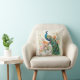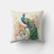 Decorator throw pillow with a painting of an elegant blue and green peacock in the branches of a tree full of pink and peach-coloured flowers.