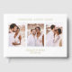 Simple and elegant three photo wedding guest book features gold foil personalised wedding text, and can include the wedding couple's names and wedding date, or edited to your own custom message. The back and spine are a classic pastel blue colour, while the front is clean white making a beautiful backdrop for the gold foil typography.